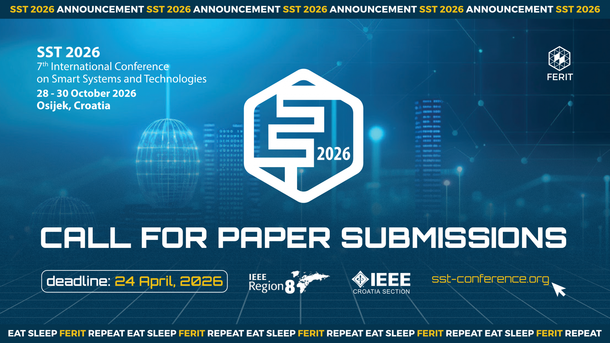 The call for paper submissions for the 7th International Conference on Smart Systems and Technologies – SST 2026 is officially open. The conference will take place from 28 to 30 October 2026 in Osijek (Croatia), and the deadline for paper submission is 24 April 2026.