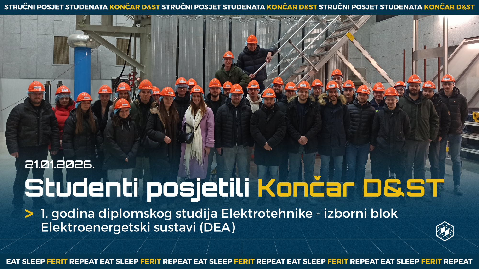 U srijedu, 21. siječnja 2026., studenti 1. godine diplomskog studija Elektrotehnike, izborni blok Elektroenergetski sustavi (DEA), posjetili su tvrtku Končar Distributivni i Specijalni Transformatori (Končar D&ST). Posjet je organiziran u sklopu laboratorijskih vježbi iz kolegija Elektroenergetski transformatori i vodovi.