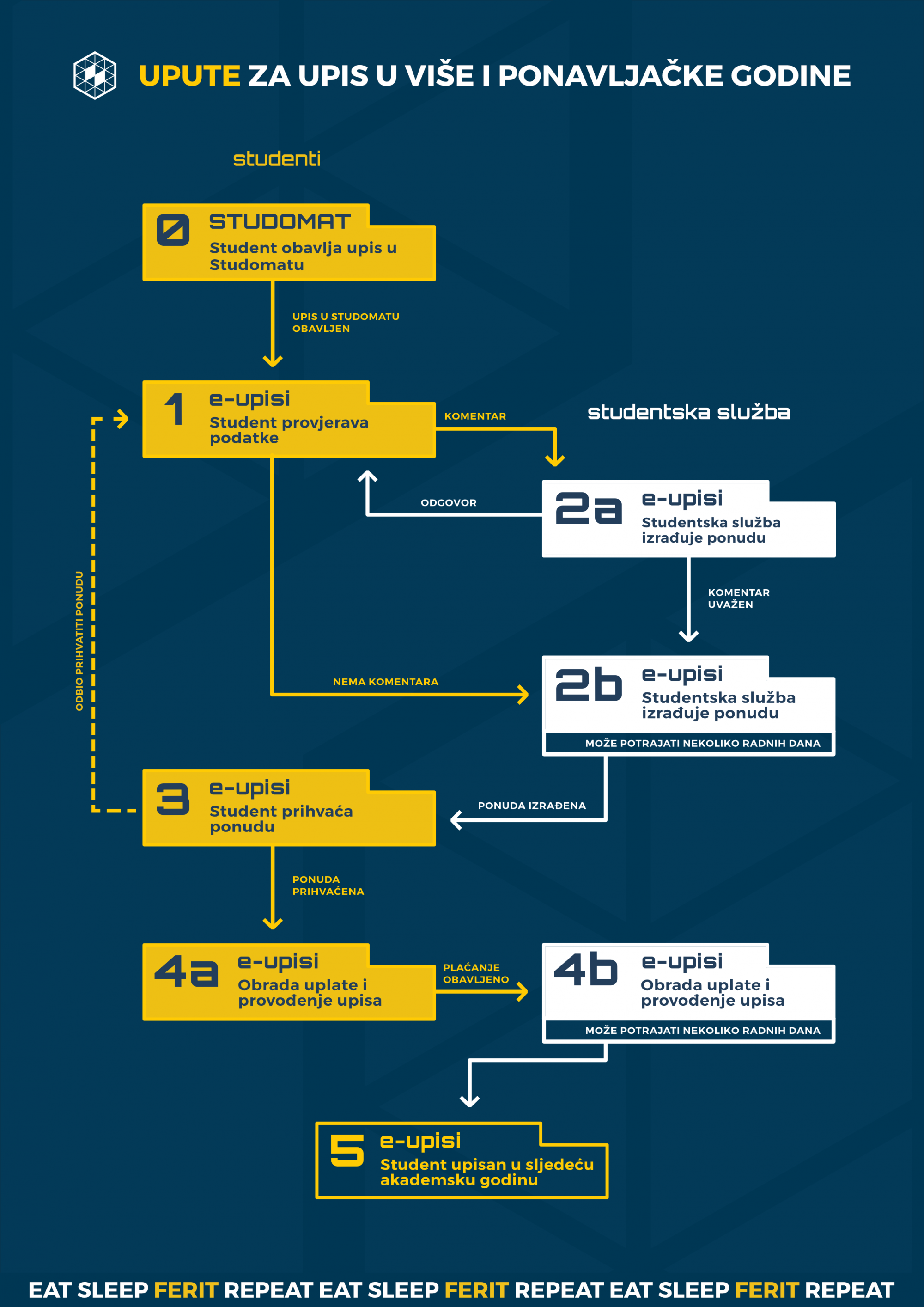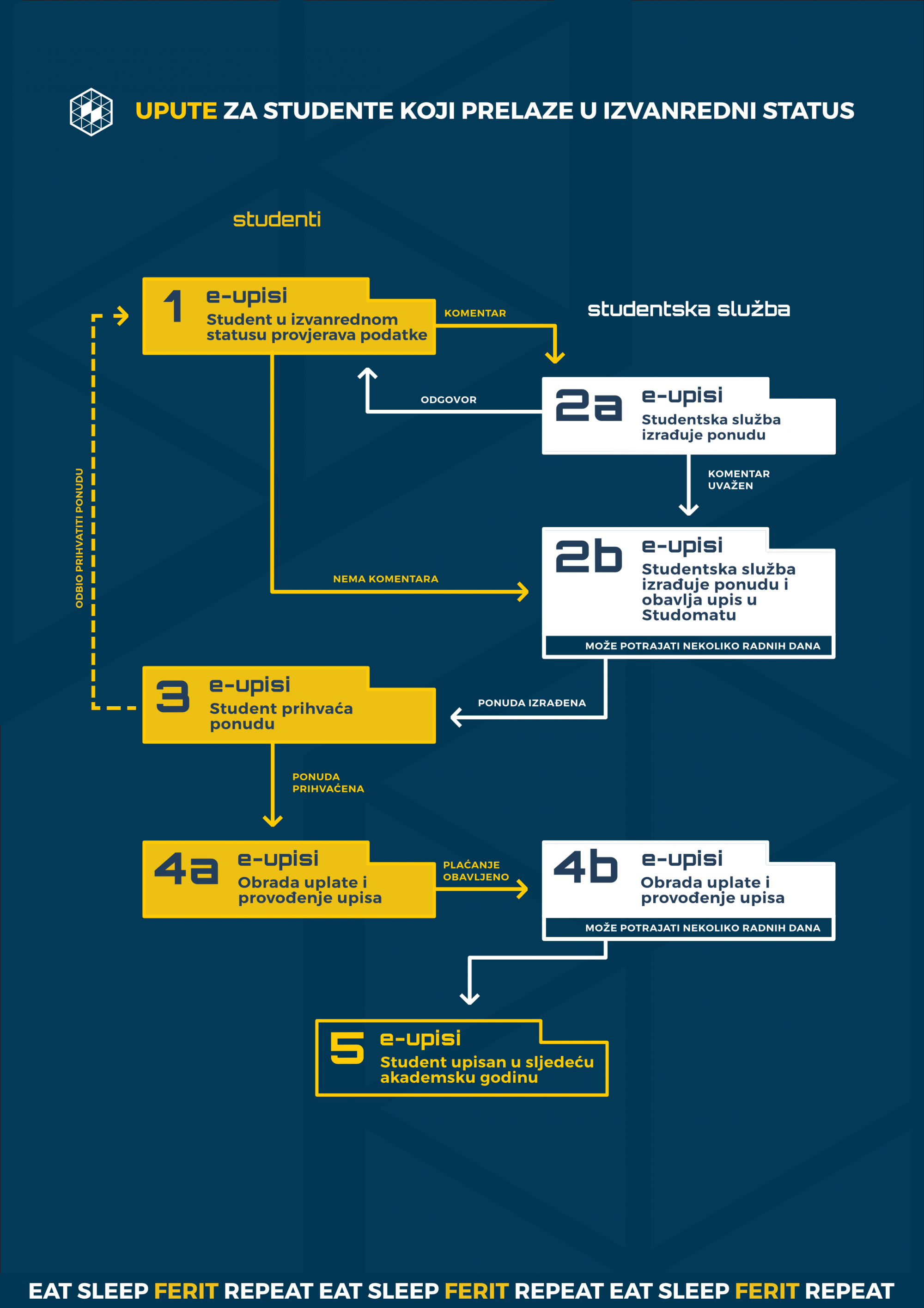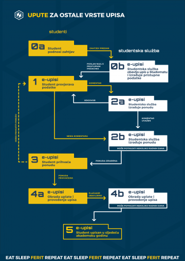 Nakon upisa na ISVU Studomatu, (kojeg moraju i mogu obaviti svi studenti koji ostaju redoviti studenti, studenti koji su u statusu dovršetka studija od prije i posjeduju Odluku/Rješenje o dovršetku studija (Upute za upis preko studomata) i studenti koji su u izvanrednom statusu od prije), studenti se obavezno prijavljuju na https://e-upisi.ferit.hr/ pomoću AAI identiteta (potrebno je odabrati kategoriju upisa za koju se prijavljuje-kategorija se odabire u padajućem izborniku) te završavaju proceduru upisa. Svi ostali studenti: a to su oni koji gube status redovitih studenta i prelaze u izvanredan status, koji su preuzeli Rješenje o mirovanju, prelasku na studij ili nastavku studija ne upisuju se sami preko ISVU Studomata već će njihov upis provesti studentska služba nakon što odrade potrebne korake u https://e-upisi.ferit.hr.