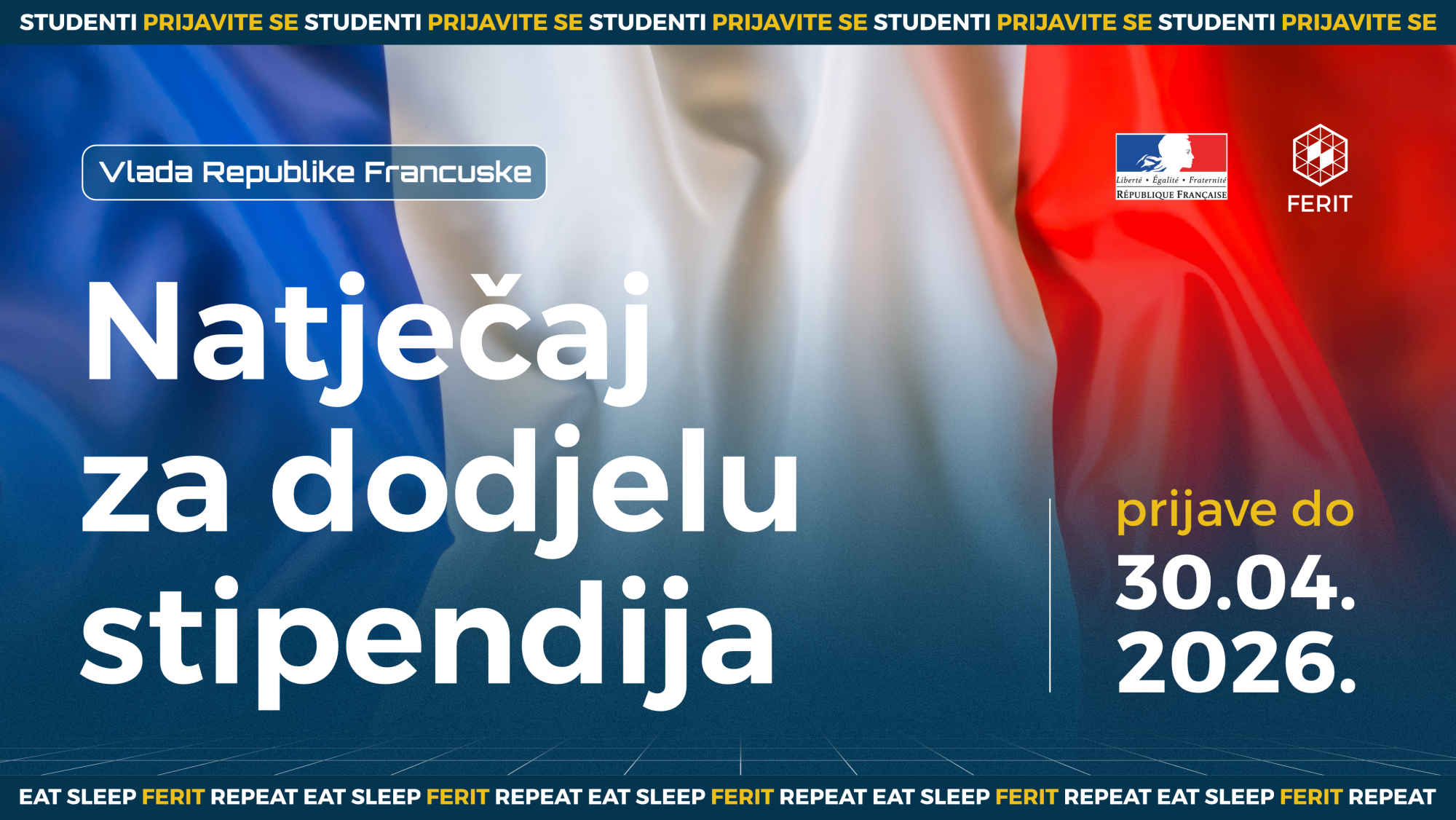 Veleposlanstvo Francuske Republike u Republici Hrvatskoj, u suradnji s Ministarstvom znanosti, obrazovanja i mladih Republike Hrvatske te Agencijom za mobilnost i programe Europske unije, objavilo je poziv na podnošenje prijava za stipendije Vlade Francuske Republike za diplomski studij i poslijediplomsko stručno usavršavanje u Francuskoj tijekom akademske godine 2026./2027.